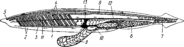 1 — брюшная аорта, 2 — расширенные основания жаберных артерий, 3—жаберные артерии, 4 — корни спинной аорты, 5 — сонная артерия, 6 — спинная аорта, 7 — хвостовая вена, 8 — подкишечная вена, 9 — воротная система печени, 10 — вена околожаберной полости, 11 — левая передняя кардинальная вена, 12 — левая задняя кардинальная вена, 13 — левый кювьеров проток