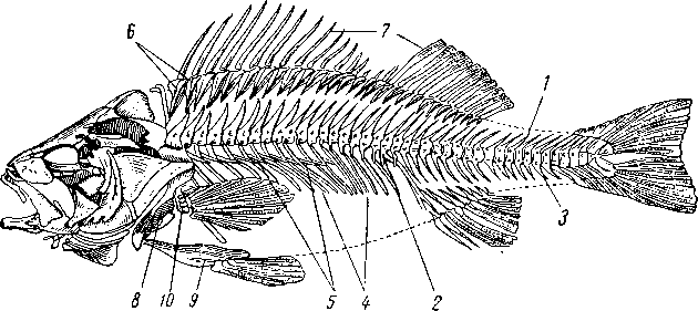 1 — верхний остистый отросток, 2 — нижняя дуга позвонка, 3 — нижний остистый отросток, 4 — ребра, 5 — мускульные косточки («верхние ребра»), 6 — радиалии спинного плавника, 7 — плавниковые лучи, 8 — плечевой пояс, 9 — тазовый пояс, 10 — радиалии грудного плавника