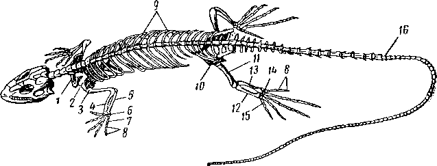 1 — ключица, 2 — лопатка, 3 — плечо, 4 — лучевая кость, 5 — локтевая кость, 6 — запястье, 7 —пястье, 8 — фаланги пальцев, 9 — ребра, 10 — таз, 11 — бедро, 12 — большая берцовая кость, 13 — малая берцовая кость, 14 — предплюсна, 15 — плюсна, 16 — хвостовые позвонки