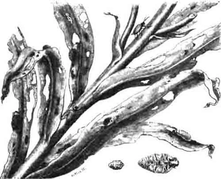 Рис. 119. Превращение криоцера лилейного (Crioceris merdigera L.)= личинки на листьях, жуки— на стебле и куколки внизу. (По Blanchard)