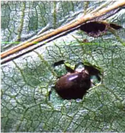 Добираясь до тычинок и пестиков, жуки прогрызают бутоны сбоку и портят будущие цветки и плоды. Уже этим они наносят большой ущерб урожаю. Несколько насытившись, самки приступают к откладке яиц. Поначалу они откладывают их на нижнюю сторону молодых листочков, а как только появятся первые цветки, забираются на них, чтобы теперь уже размешать яйца внутрь цветков и на верхушки молодых завязей. Плодовитость самки 30 — 40 яиц.
