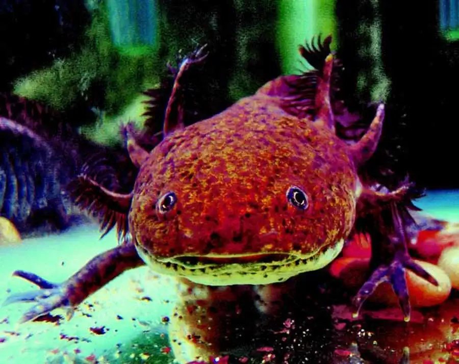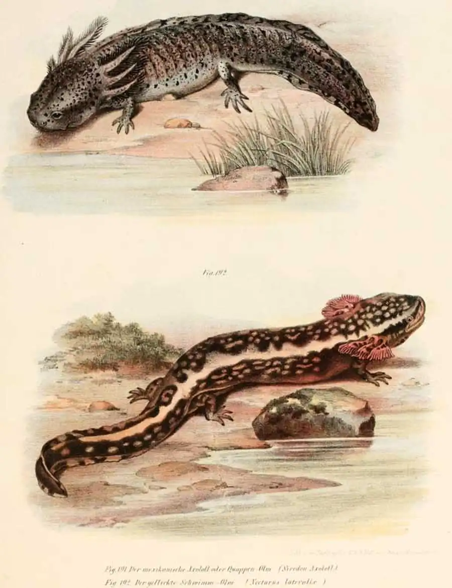 Такое экзотическое название носит личиночная форма земноводного семейства амбистомовых отряда хвостатых. Ее еще называют водным монстром или водяной саламандрой. Забавная особенность этой личинки в том, что она может размножаться на стадии личинки, т.е. не достигнув фазы взрослой формы, без метаморфоза. Щитовидка у этой личинки развита неплохо, но .как правило, она не вырабатывает необходимое количество гормона тироксина, который мог бы спровоцировать процес метаморфоза.