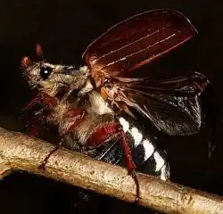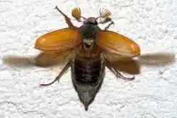 Сверху к груди прикрепляются крылья: ко второму членику - крепкие хитиновые надкрылья бурого цвета, которые поддерживают тело жука в полете, к третьему членику прозрачные летательные крылья. Майский жук довольно неуклюж, медленно и тяжело летает.