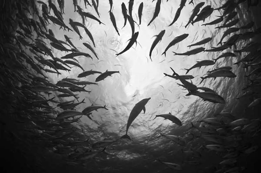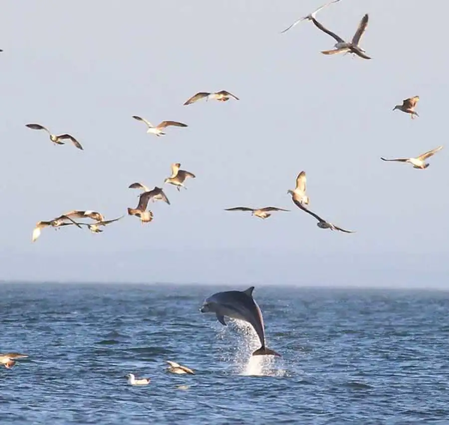 У дельфинов чрезвычайно развита взаимоподдержка и выручка, они умеют действовать коллективно, сообща, во время охоты. Переговариваясь особыми сигналами, он слаженно окружают косяк рыбы, не давай им уплыть.