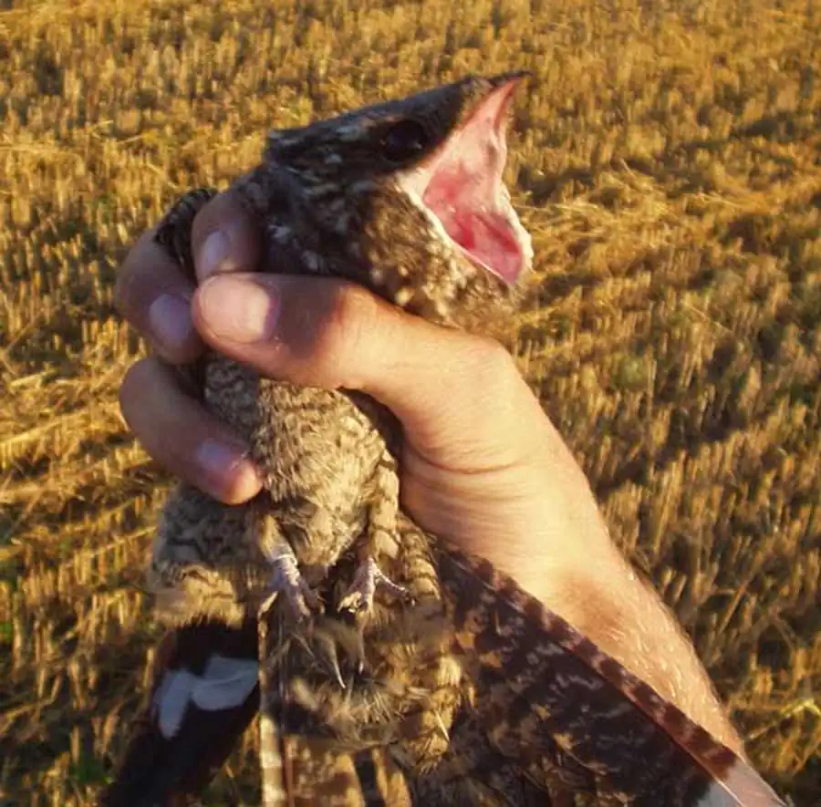 Если козодоя вспугнуть, эта трель сменится более высоким по тону и возмущенным «фюрр-фюрр-фюрррюю…», словно рокот мотора вдруг захлебнулся. Окончив печение, козодой всегда взмывает ввысь и улетает. Обычно это токование начинается через пару-тройку дней после прилета самцов с зимовки и длится все лето, с небольшой паузой в середине июля.