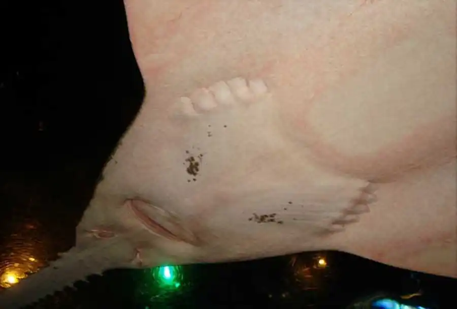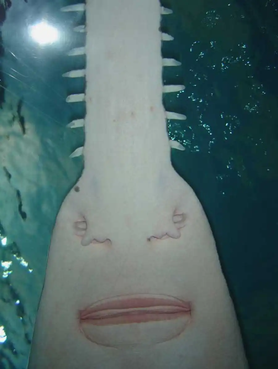 Если посмотреть на брюхо пилорылого ската, то пара жабер и ротовое отверстие вместе похожи на плаксивое лицо.