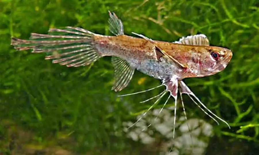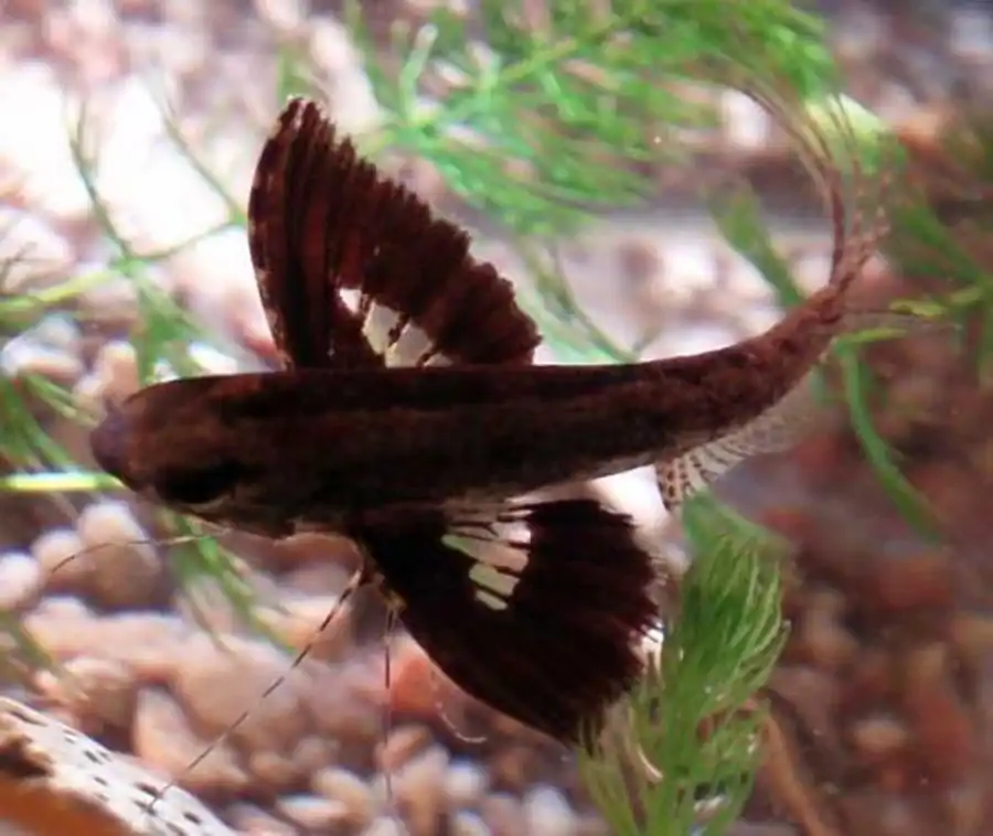 Спинной плавник короткий и находится перед самым хвостом. Спинной плавник имеет 6 мягких лучей, анальный плавник имеет 9-15 лучей, у самцов лучи из середины этого плавника, в период нереста, образуют копулятивный орган в виде трубочки. Хвост длинный и на конце заостренный, имеет два удлиненных луча.