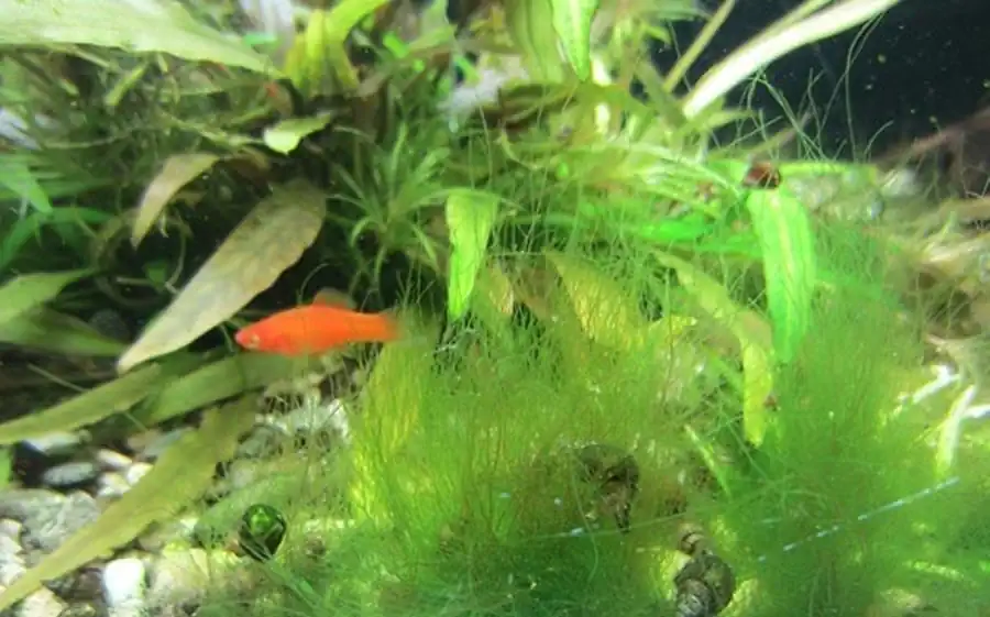 Кладофора (Cladophora aegagrophila). Колония тонких ниточек-водорослей образует темно-зеленый пушистый шар. Отдельные ниточки растут от центра наружу, при увеличении размера шара внутренние концы их отмирают, и он оказывается полым внутри. Диаметром кладофора может достичь и 15 см, но растет она очень медленно. Размножается шар, распадаясь на отдельные бесформенные пучки, из которых постепенно образуются новые шарообразные колонии, однако процесс этот длится годами. В аквариуме кладофора не только удивляет зрителя своим «марсианским» видом, но и приносит несомненную пользу. Она активно втягивает муть, являясь неплохим живым фильтром. Время от времени ее приходится извлекать и промывать теплой водой, выжимая, как губку. Вреда от этого кладофоре не будет. Не любит кладофора только слишком теплой воды.