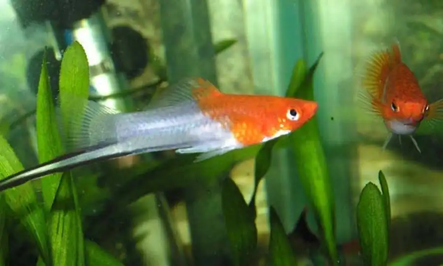 Скрещивая его с различными цветовыми вариациями пецилии (X. maculatus), получили и продолжают получать все то разнообразие гибридных форм, которое вы встречаете в аквариумах. Кроме описываемых, аквариумисты содержат еще несколько видов диких меченосцев. Но эти рыбки редки, дороги и не совсем акклиматизировались в аквариумах. Максимальный размер селекционных видов меченосцев достигает 10 см без меча у самцов и 16 см у самок. Средние размеры значительно меньше. Самец отличается длинным мечеобразным выростом на нижней части хвостового плавника — мечом. Окраска самцов и самок одинаковая. Селекционерами выведено огромное количество разнообразных по форме плавников и по окраске рыбок. Популярны вильчатые меченосцы с двумя мечами — верхним и нижним, с удлиненными спинным и анальным плавниками. У некоторых пород мечи и удлиненные плавники имеют и самки, так что новичок начинает путаться. Главным отличием остается все-таки гоноподий. При внимательном рассмотрении можно заметить, что первые лучи анального плавника самца толще и мутные на просвет, а у самок не отличаются от остальных. Определение затрудняется еще и поздним половым созреванием гибридных форм — некоторые разновидности определяются только к году.
