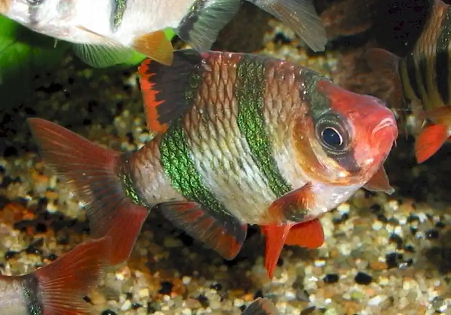 Барбус суматранский (Barbus tetrazona tetrazona). Самый популярный вид. Достигает 7 сантиметров длины. Тело высокое, несколько уплощенное с боков, соломенно-желтого цвета. Через весь корпус проходят широкие и яркие черные вертикальные полосы. Самец мельче и ярче самки. У него красное рыло и крайние лучи хвостового плавника. Самка крупная, широкая, с полным брюшком. Замечена интересная особенность поведения рыбок. В общем аквариуме мирно ведет себя или одинокий «суматранус», или стайка из 6 и более рыбок. Если же барбусов от 2-х до 5-ти особей, они начинают задираться и хулиганить.