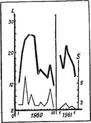 В среднем получается, что чем активнее Солнце, тем сильнее лейкопения. Иначе говоря, с ростом солнечной активности увеличивается и количество лиц с пониженным числом лейкоцитов. Если в 1 ммг крови здорового человека содержится 6—8 тысяч лейкоцитов, то при лейкопениях это количество снижается в два-три раза. Обратите внимание — кривая, показывающая число лиц, у которых замечена лейкопения, и кривая солнечной активности очень сходны.