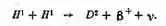 Этап первый: два протона (обозначим их H1 и H1), взаимодействуя, превращаются в ядро дейтерия D2 — изотоп водорода. При этом образуется также позитрон («положительный электрон») b+ и знаменитое нейтрино v — частица неуловимо малой массы, лишенная электрического заряда. Всю эту цепочку превращений можно записать так: