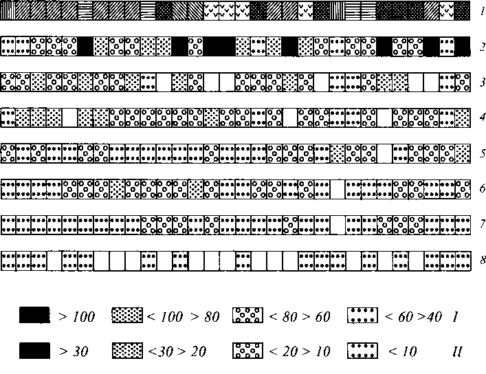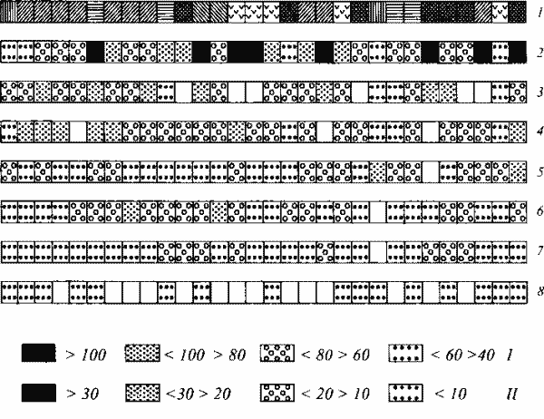 Пример данных по распределению коллембол в линейной серии проб в осоковомоховой мелкобугорковой тундре (Западный Таймыр), каждая клеточка - одна проба (5x5 см): 1 - доминирующие виды мхов, 2 - все коллемболы суммарно, 3-8 - отдельные виды коллембол; I - шкала обилия для всех видов суммарно; II - для отдельных видов.