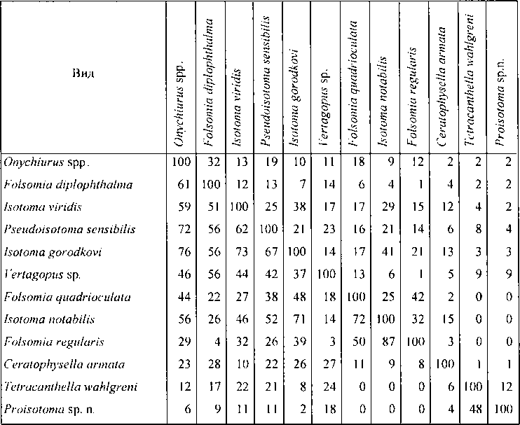 Так, достаточно обособлены тесно связанные с почвой Onychiurus (три вида суммарно) и Folsomia diplophthalmci. Другая обособленная пара - специфичные обитатели оголенных грунтов пятнистой тундры - Tetracanthella wahlgreni и Proisotomci sp. n. Монолитную группу образуют эврибионтные гемиэдафические Isotoma viridis, Pseudisotoma sensibilis, Isotoma gorodkovi. Особняком стоит гигрофильная Ceratophysella armata, которая со всеми видами дает невысокие индексы.