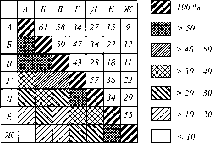 Диаграмма-решетка сходства группировок почвенных беспозвоночных, учтенных в пробах 25x25 см в различных биотопах Центрально-Черноземного заповедника (индексы рассчитаны по соотношению массы семейств беспозвоночных): А - косимая степь, Б - некосимая степь, В - центральная часть поляны среди дубравы, Г - край поляны, Д - облесенный лог в степи, Е - плакорная дубрава, Ж - днище оврага в лесу.