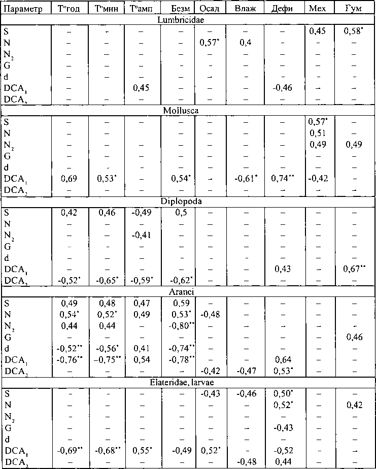 Корреляция параметров разнообразия различных групп беспозвоночных с факторами среды