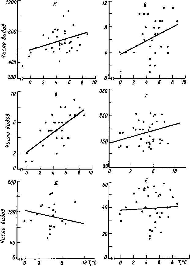Связь числа видов сосудистых растений и наземных позвоночных заповедников Русской равнины со среднегодовой температурой: А - сосудистые растения, Б - земноводные, В -пресмыкающиеся, Г - птицы (вся фауна), Д - гнездящиеся птицы, Е - млекопитающие. Величина корреляций и источники данных.