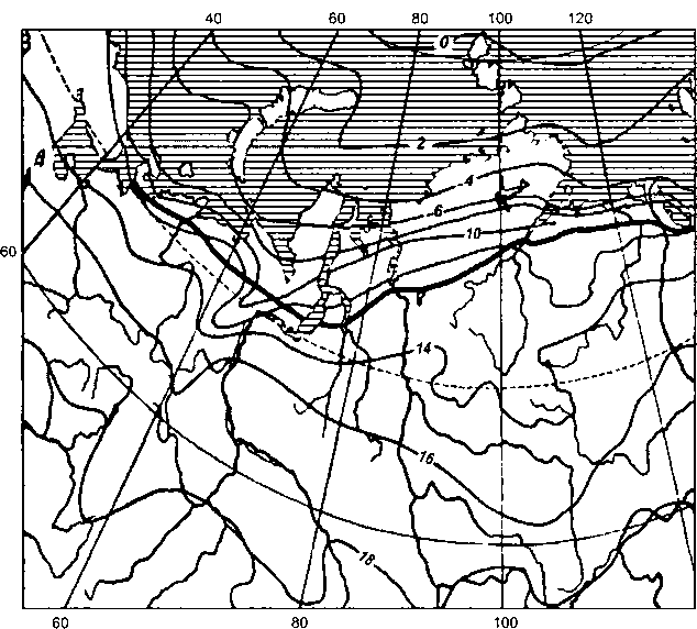 Распределение среднеиюльских температур (по: Агроклиматический атлас мира, 1972; Атлас океанов, 1980); жирная линия - южная граница тундровой зоны.