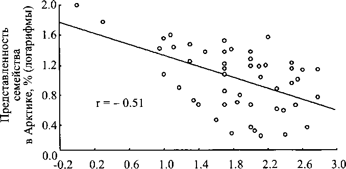 Примеры успешного освоения среды Арктики и хорошей представленности в ее биоте небогатых видами таксонов, а также монотипических родов можно найти в самых разных группах организмов (см.: Чернов, 1984а, 1995, 1999). В целом, пожалуй, более отчетлива тенденция повышения значимости в арктической биоте маловидовых таксонов. Математический анализ связей между представленностью в Арктике и видовым богатством таксонов в пределах классов вполне подтверждает эти положения, хотя корреляции, как правило, не столь сильные. Один из примеров показан на рисунке.