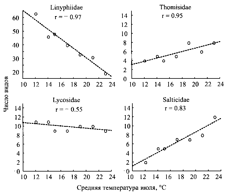 Связь числа видов (конкретные фауны) нескольких семейств пауков (Aranei) со среднеиюльской температурой на территории Урала и Приуралья (по данным С.Л. Есюнина, 2005).
