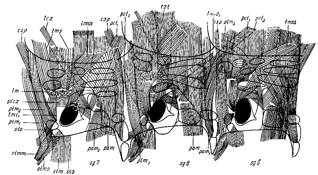 Система трансверзальной мускулатуры, расположенной глубже продольной соматической мускулатуры, связывает границу стернальных щитков с тергальным скелетом и плейрой.