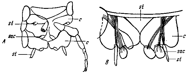 Machilis sp. A — заднегрудь и два первых сегмента брюшка (снизу) молодой особи с одним выпячиваемым мешочком на рудименте ножки, В — сегмент (2-й) брюшка взрослой особи (снизу) с двумя выпячиваемыми мешочками на рудименте ножки