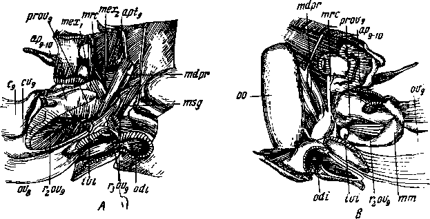 Яйцеклад в продольном сечении с изображением его мускулатуры: А — левая половина, В — правая половина