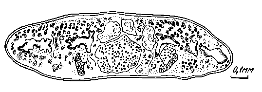 Описание (по Иванову, Мурыгину, 1937). Длина тела 10,06 мм, ширина 3,06 мм. Тело продолговато-овальное, расширяющееся в задней части и несколько суженное на головном конце.