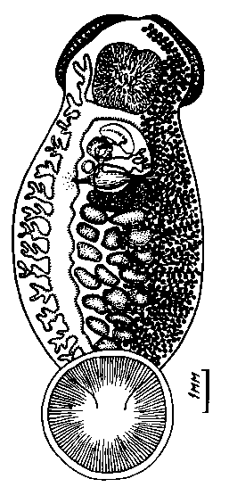 Задняя присоска (диаметр 2,06 мм) имеет правильную сферическую форму и вооружена тремя парами крючьев, одна пара длинных крючьев лежит в центре диска, а две пары остальных крючьев прикреплены к заднему краю диска по одной паре на некотором расстоянии друг от друга. Несколько отступя от переднего края тела, медианно располагается ротовое отверстие, ведущее в сферический фаринкс (диаметр 0,8 мм), который переходит в два ствола кишечника (длина 5,7 мм), соединяющихся перед задней присоской. Иногда брюшная присоска может прикрывать конечные стволы кишечника.