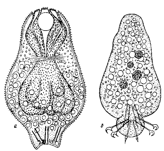 a — люкофора, извлеченная из зрелого яйца; б — процеркоид на пятый день развития в Corophium curvispinum