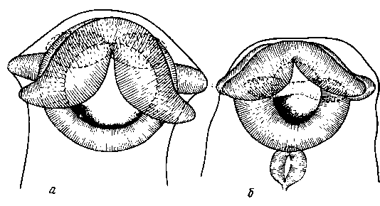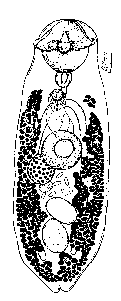 Вторая и третья пары выростов имеют вид бугорков, и мускульные массы их располагаются между стенками кожно-мышечного мешка и мышечной массой ротовой присоски. Все три пары выростов образуют как бы шейный воротник на голове трематоды. Треугольник, образующий отверстие ротовой присоски, достигает 0,24 X 0,23 мм. Брюшная присоска имеет размеры 0,27 X 0,28 мм и располагается несколько впереди середины длины тела.