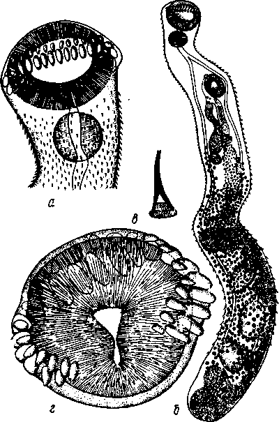 a — головной конец; б — марита; в — кутикулярный шипик; г — головной конец апикально