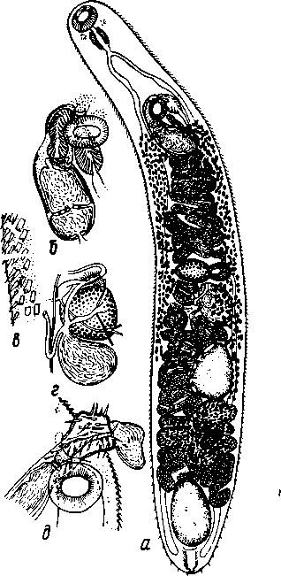 a — марита; 6 — концевые элементы половой системы; в — женский половой аппарат; г — часть вывернутого цирруса; д — часть кутикулы с шипиками