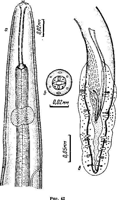 a — головной конец латерально; 6 — головной конец апикально; в — хвостовой конец самца