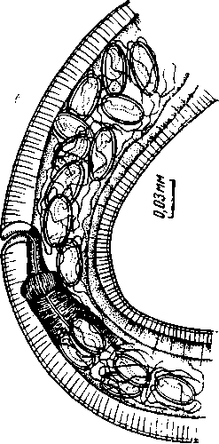Ascarophis ovotrichuria (Skrjabin, 1924) от Acipenser baeri (В.) Енисея (по Скрябиной, 1966). Область вульвы самки