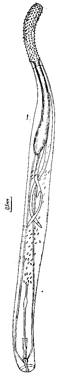 Нервный ганглий в передней половине хоботкового влагалища. Яйца веретенообразной формы 0,136—0,150 мм длиной, 0,035—0,039 мм шириной, средняя оболочка образует выпячивание к полюсам.