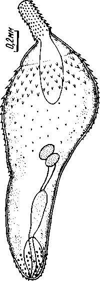 Самка (от шипа; описание по 2 экз.). Длина тела 4,00—4,15 мм, ширина в передней расширенной части тела 1,26—1,38 мм, хвостовой—1,47—1,78 мм. Длина хоботка 0,52—0,63 мм, ширина 0,21 мм. Число рядов крючьев на хоботке и размеры крючьев на хоботке и на поверхности тела те же, что и у самца. Длина влагалища 1,05 —1,09 мм, длина шейки 0,27 —0,35 мм.
