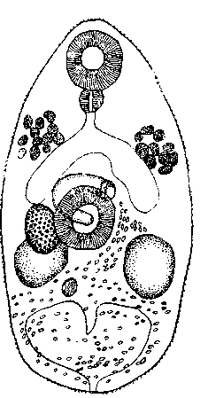 Однако нередко можно распознать большой V-образный выделительный пузырь, стволы которого доходят до семенников. Желточники лежат в стороне и в передней половине тела; каждый желточник представляет собой вытянутую в длину и лежащую вне и над кишечными стволами гроздь, состоящую из немногих, довольно больших фолликулов. Многочисленные овальные яйца достигают 0.014—0.018x0.009 мм.