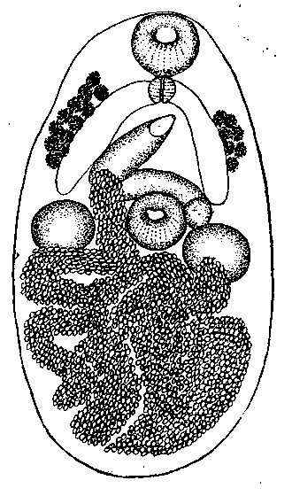 Семенники круглые; в средине они охватывают между собой значительно меньшую брюшную присоску. Яичник эллиптической формы, расположен впереди и наискось от семенника. Семеприемник прикрыт маточными петлями, поэтому автор никогда не мог его видеть достаточно ясно. Матка заполняет весь конец тела позади семенников и брюшной присоски.