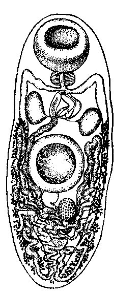 Оба семенника лежат близко у брюшной присоски; задний край, правого лежит дорзально от брюшной присоски и прикрывает ее передний край; край левого доходит почти до середины брюшной присоски. Передние края семенников доходят до горизонтального уровня кишечных стволов.