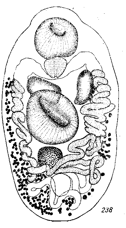 Яичник округлой формы, 0.246 мм длины и 0.246 мм ширины, расположен непосредственно позади брюшной присоски, на средней линии тела, на расстоянии 0.374 мм впереди от заднего конца тела. Тельце Мелиса у заднего края брюшной присоски, немного слева от средней линии тела, на расстоянии 0.750 мм от заднего конца. Матка распределяется главным образом позади брюшной присоски и по бокам тела. Петли матки достигают уровня переднего края семенников. На'этом же уровне начинаются желточники, состоящие из мелких фолликулов; дойдя до заднего конца тела, желточники сливаются на средней линии. Матка наполнена многочисленными зрелыми яйцами овальной формы, 0.022x0.013—0.016 мм.
