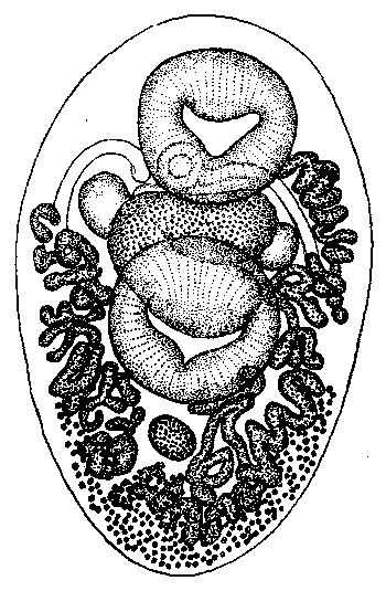 Желточники лежат в задней половине тела и занимают боковые пояса вентральной поверхности; они начинаются несколько впереди переднего края брюшной присоски и тянутся до заднего края тела, не соединяясь сзади друг с другом, как у Eumegacetes contribulans. Прохождение матки нельзя проследить в отдельных частях; две главные петли лежат по сторонам тела и доходят спереди до ротовой присоски, другие распространяются в заднем конце, между тем как довольно обширный конечный отдел тянется напрямик между семенниками к половому отверстию. Многочисленные яйца коричневые, овальные на одном конце, 0.025 x 0.014 мм.