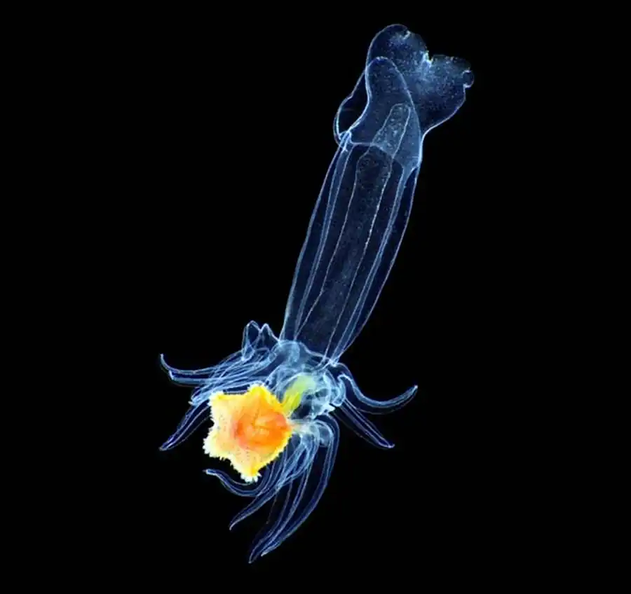 2. Пропитывание водою. Многие планктические растения и животные отличаются очень большим содержанием воды. Количество ее нередко превышает 90%, что имеет большое значение для уменьшения остаточного веса, так как плазма, удельный вес которой в среднем равен 1,05, тяжелее не только пресной, но и морской воды (удельный вес пресной воды равен 1,00, а для морской воды колеблется, в зависимости от температуры и солености, от 1,02 до 1,03). Пропитывание водою приводит к образованию студенистого вещества, особенно сильно развитого у медуз и си-фонофор, а также у пелагических моллюсков, сагитт (Chaetognatha) и ряда других животных. У пресноводных организмов чаще наблюдается выделение прозрачного студенистого вещества, покрывающего тело снаружи, как, например, у некоторых синезеленых и десмидиевых (Desmidiaceae) водорослей, а также у некоторых коловраток. У многих радиолярий внутри тела имеются вакуоли, содержащие жидкость удельно более легкую, по сравнению с морской водой. Внутри Noctiluca (Cystoflagellata) находится большое количество клеточного сока.