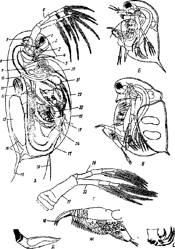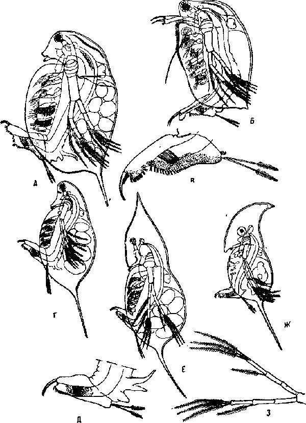 А— В—Daphnia magna, самка (А), самец (В), постабдомеи самки (В), Г, Д —Daphnia longispina, самка (Г), постабдомен самки (Д); В — Dap cucullata, самка; Ж, 3 — Daphnia cristata, самка (Ж), антенна (3).