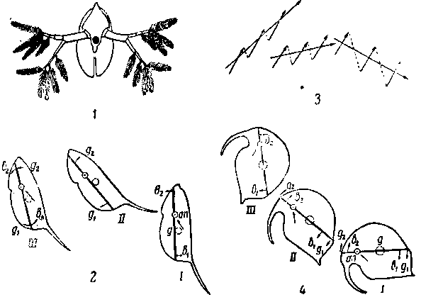 Daphnia в фазу опускания, вид сверху; 2 — фазы движения молодой Daphnia; 3 — изменение курса движения Daphnia в зависимости от длительности паузы между ударами антенн; 4—фазы движения Bosmina (перевертывания через голову, фаза III, не происходит благодаря сопротивлению, оказываемому антеннулами).