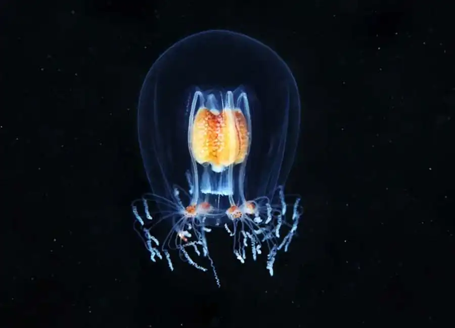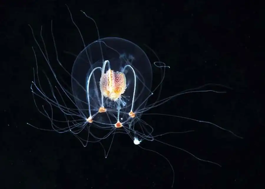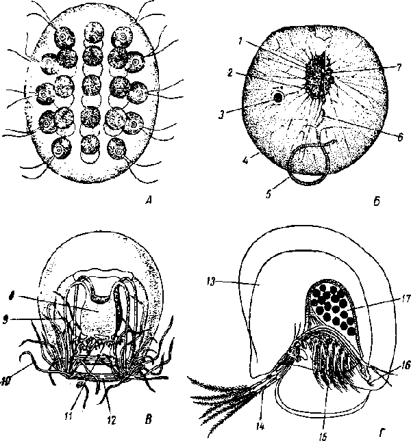 1 — центральное скопление плазмы, 2 — ядро, 3 — пищевая вакуоль, 4 — пелликула, 5 —щупальце, 6 —жгутик, 7 —цитостом, 8— манубриум, 9 — радиальный канал, 10 — краевые щупальца, 11— ротовые щупальца, 12 — парус (velum), 13 — студенистый шар, 14 — антенны, 15 — грудные ноги, 16 — каудальные когти, 17 — выводковая камера.