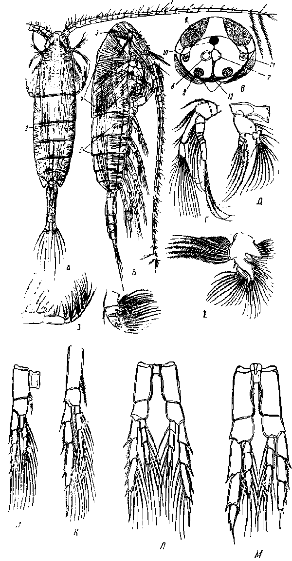Calanus finmarchicus. А — самка; Б — самец; В — поперечный разрез через третий грудной сегмент; Г—антенна; Д—мандибула; Е—максилулла; Ж — максилла; 3 — максиллярная нога; И — нога первой пары; К—нога четвертой пары; Л—ноги пятой пары самки; М — ноги пятой пары самца.