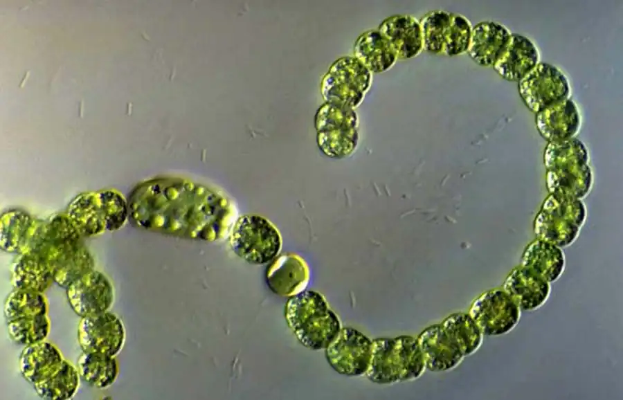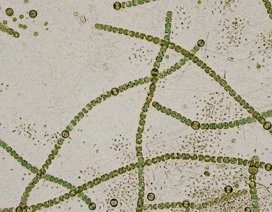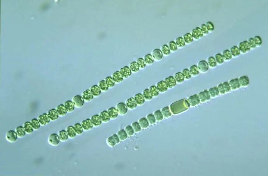 Между вегетативными клетками находятся особые пограничные клетки, или гетероцисты, превосходящие обычно величину вегетативных клеток и отличающиеся утолщенностью оболочки и иной окраской, что зависит от исчезновения ассимилирующего пигмента. Кроме гетероцист в нитях находятся также покоящиеся клетки, споры, способные переносить неблагоприятные условия и прорастать в новую нить; споры отличаются своей величиной и большей толщиной оболочки, по сравнению с вегетативными клетками. У многих видов синезеленых водорослей можно обнаружить присутствие в клетках многочисленных неправильной формы газовых вакуолей; благодаря им удельный вес водорослей становится меньше удельного веса воды. Особенно велико значение этих образований для планктических водорослей, которые вначале развиваются у дна, а затем при помощи газовых включений всплывают к водной поверхности.