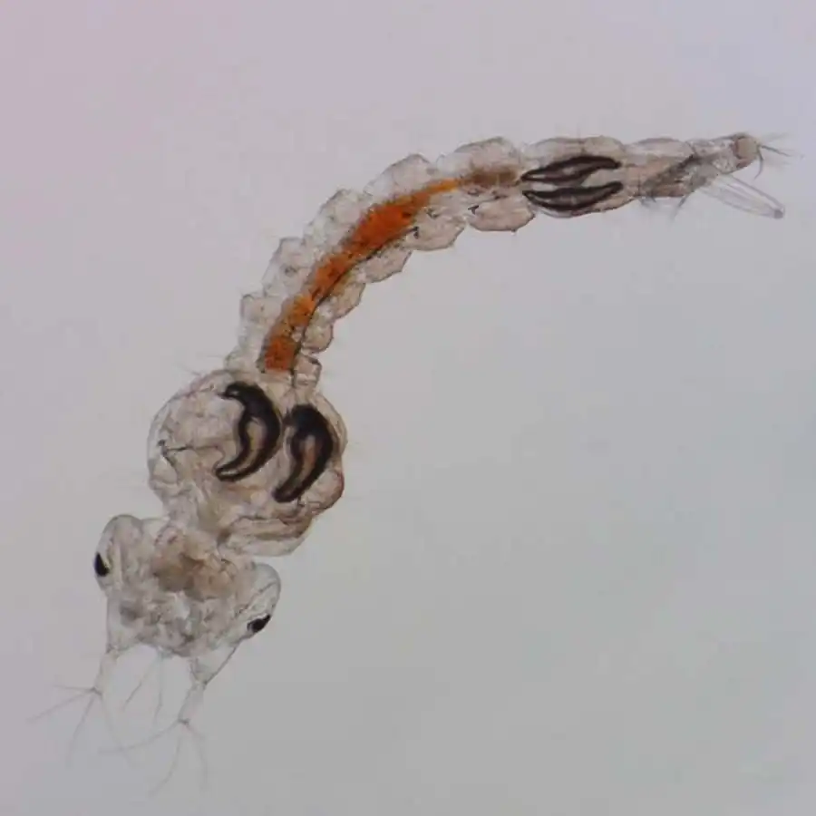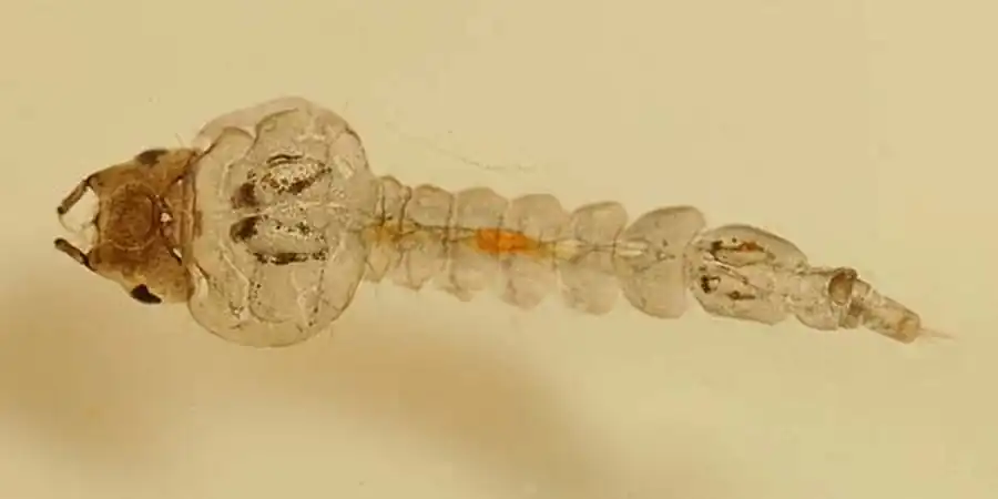 Верхняя губа представлена четырьмя небольшими согнутыми щетинками, расположенными между основаниями антенн. Хорошо развитый эпифаринкс на конце несет шипы. Мандибулы с зубцами и хватательным веером. Грудной сегмент широкий, с двумя большими трахейными пузырями, вторая пара находится в седьмом брюшном сегменте. На спинной стороне восьмого брюшного сегмента расположен длинный, слабо пигментированный сифон (дыхательная трубка). Хвостовой плавник хорошо развит, анальные папиллы небольшие.