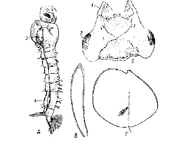 А—личинка Mochlonyx culiciformis; В — голова личинки Mochlonyx culiciformis, сверху; В, Г — куколка Mochlonyx culiciformis, трахейная трубка (В), левый хвостовой плавник (Г).